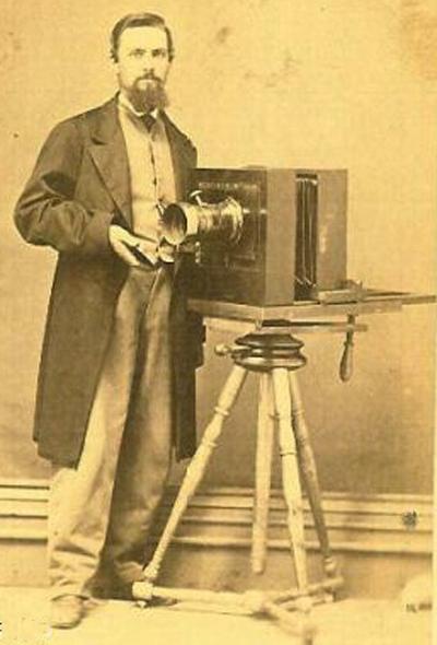 (caption: a photographer using a bellows style, wet plate camera with a Petzval style lens,circa 1865-1870) (source: antiquecameras.net)